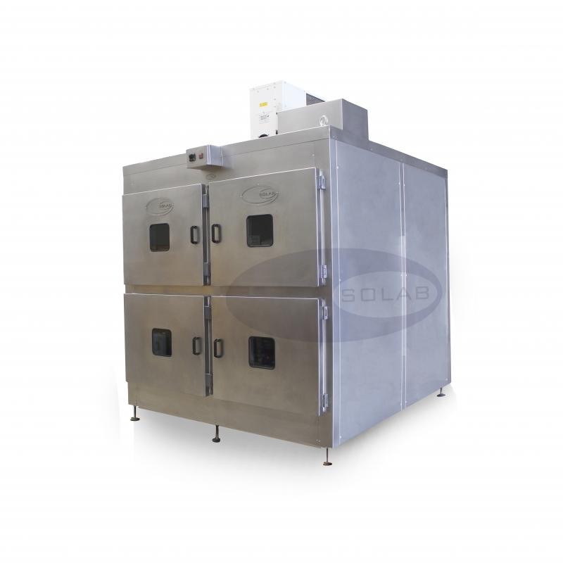 - Quatro portas em aço inoxidável AISI 304 interno e externo com visor de vidro incolor duplo, dobradiças em aço inoxidável AISI 304, puxadores e dobradiças fixadas por parafusos de aço inoxidável, AISI 304;