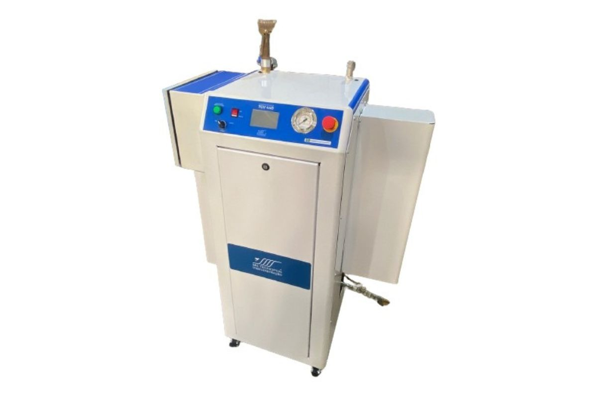 Gerador de Vapor Modelo TGV-440: Equipamento do tipo caldeira fabricado com aço carbono e tratamento anticorrosivo, possuindo gabinete em aço inoxidável para maior durabilidade e resistência à corrosão. O controle do sistema é realizado por meio de uma interface eletrônica digital, que integra um software desenvolvido internamente para gerenciamento otimizado de sensores de nível por condutividade e de temperatura utilizando sondas PT100, além de controlar o acionamento de válvulas solenóides e da bomba de enchimento automático.