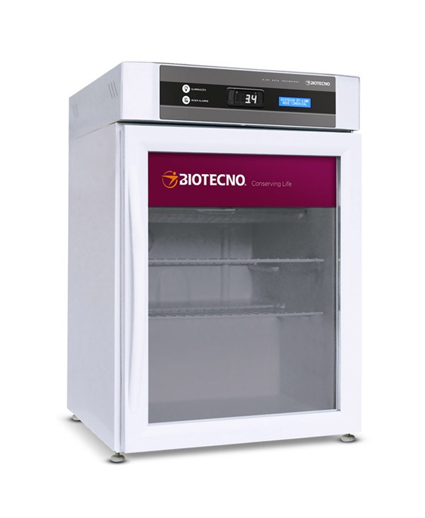Câmara para conservação de vacinas, medicamentos, toxina botulínica e termolábeis com temperatura de 2°C a 8°C, alarmes, discador telefônico e sistema de homogeneização de temperatura.
