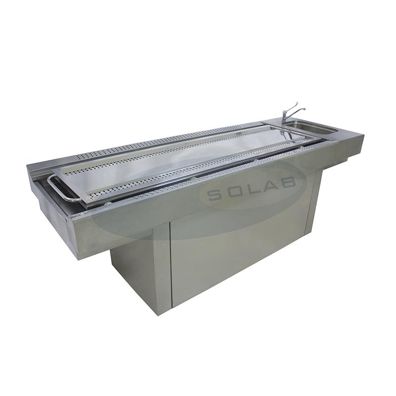 - Área de trabalho dividido em quatro partes perfuradas removíveis com espaçadores para permitir a drenagem de fluidos para o plano inferior, com declive para escoamento dos líquidos proveniente da operação, com enxague da superfície por fluxo contínuo de água através de jato de água, sendo construídas em aço inoxidável AISI 304;