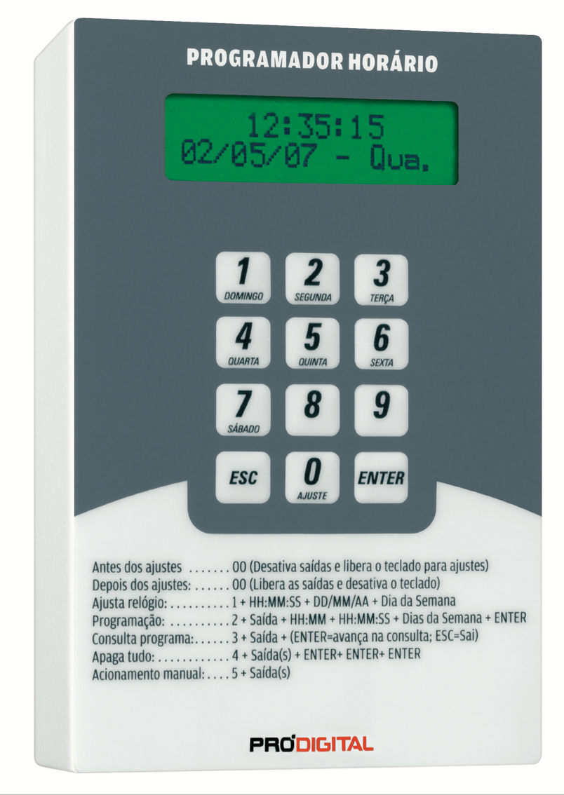 - Em falta de energia o relógio interno se mantém em funcionamento, quando a energia retorna o horário está correto.