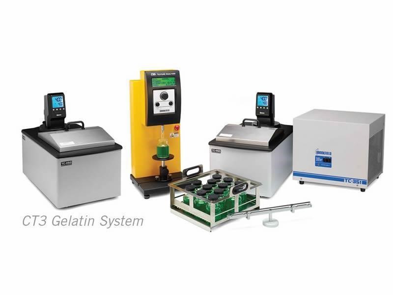 Sistema para análise de força de gel em gelatinas composto por analisador de Textura, 2 banhos termostáticos, unidade de resfriamento, ponta de prova GMIA & GME e recipientes padrão para o teste de bloom.